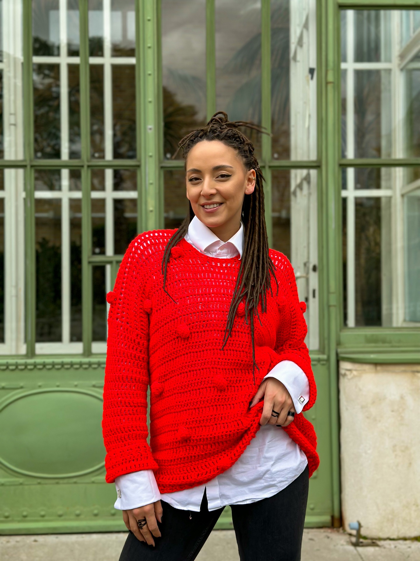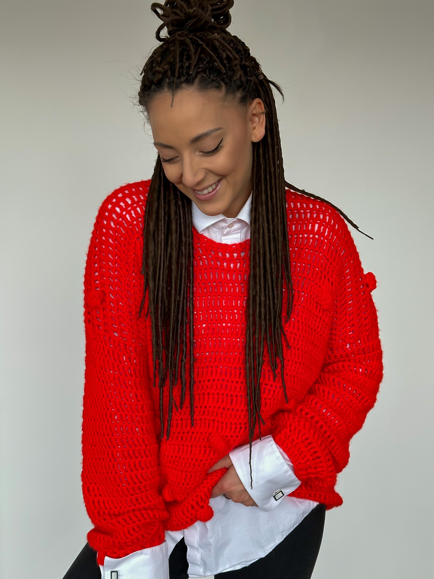 Zaujímavý svetrík s brmbolčekmi v žiarivo červenej farbe. Odlíšte sa týmto unikátnym kúskom. Vyrobený je z kvalitnej akrylovej priadze.